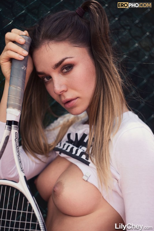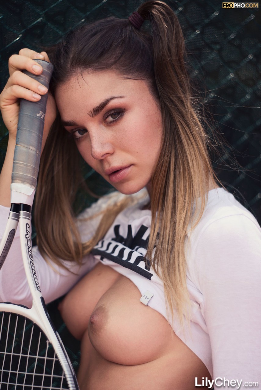 Устав играть в теннис, молоденькая нимфоманка принялась строить глазки своему тренеру. Порочная девушка несколько минут просто эротично подмигивала мужику, далее одернула короткую майку и принялась тискать упругие титьки. Оставив на теле одни лишь вызывающие черные трусики, соблазнительная шалунья Lily Chey принялась весьма энергично трясти ягодицами. Присев на корточки, пошлая милашка в белых гольфах стала нежно прижимать ракетку к паху. Хоть типок и уговаривал неженку стянуть белье и показать манду, но увы на это порочная развратница так и не решилась. Хоть теннисистка и не засветила дырок, тем не менее чуваку удалось сделать весьма красивые эро снимки.