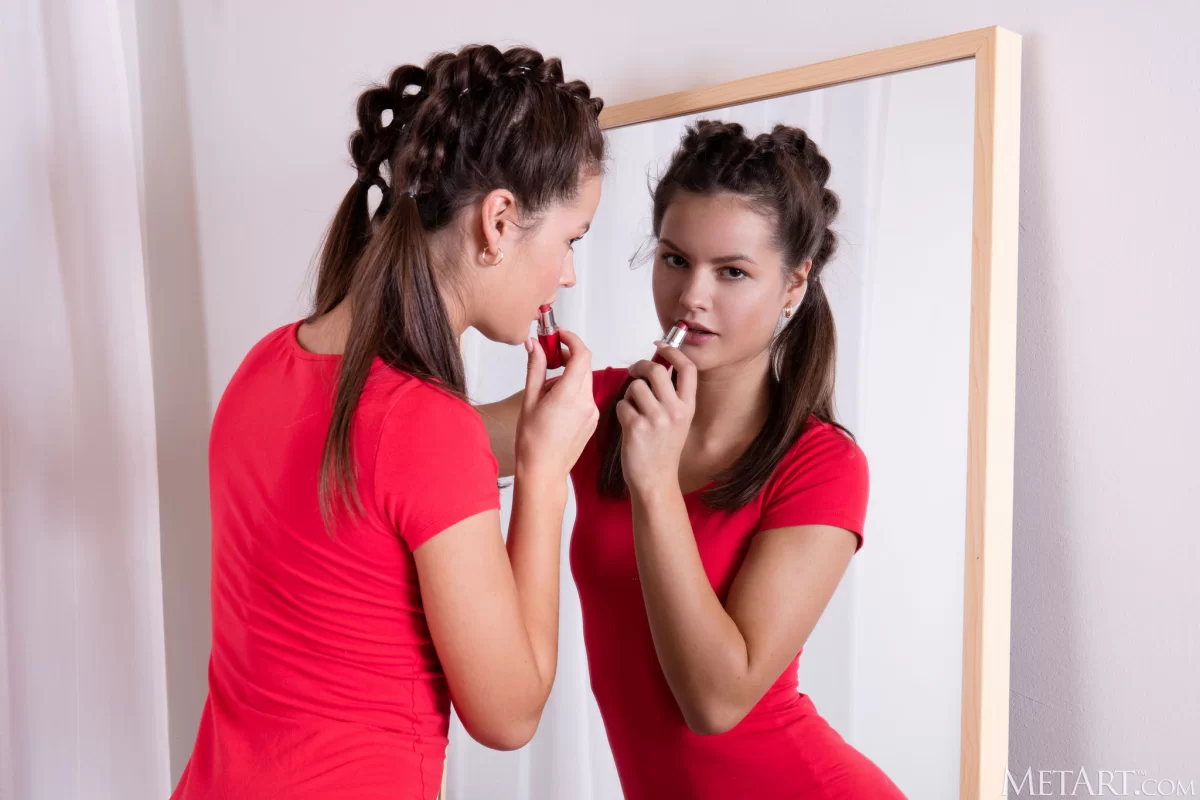 Роковая красотка Viva Fleur сексуально позирует перед зеркалом. На ее потрясающем теле облегающее платье алого цвета под которым отсутствует нижнее белье. Голая брюнетка принимает откровенные позы, показывая обалденную попку и выбритый вареник.Информация