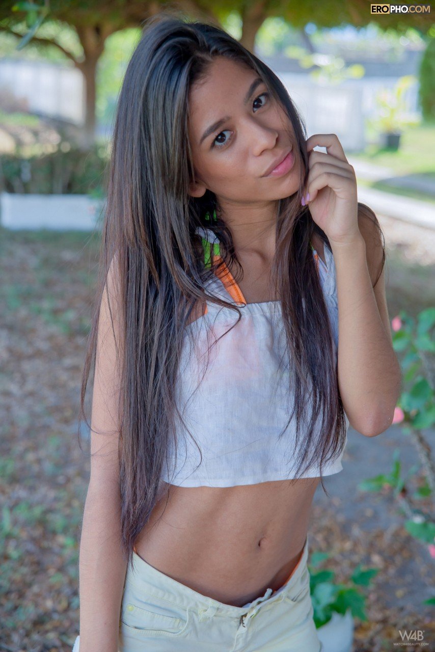 Хрупкой черноволосой девушке Karin Torres удалось весьма быстро соблазнить молодого привлекательного парня в парке. Встав под деревом, проказница с тощими ножками и маленькими сиськами стала поглаживать попку, которую слегка прикрывали короткие шортики и узкие трусики. Подмигнув самцу, красивая распутная милочка пообщалась с ним на интимные темы, а потом потащила в тихое местечко. Раздевшись, голая барышня присела, развела ноги и показала симпатичную письку. Облизав несколько пальчиков, шалунишка прижала их к клитору и приступила весьма активно дрочить. Кончив, проказница скромно прикрыло прелести ладошками, и рассказала о своих ощущениях.Информация