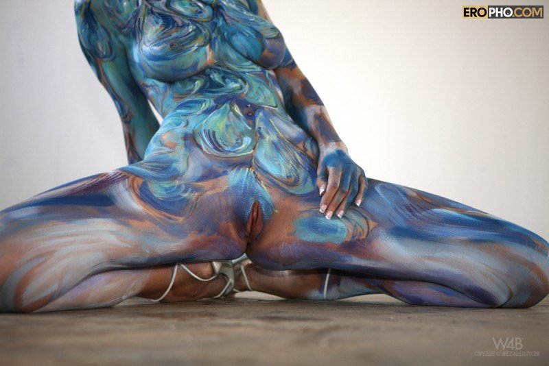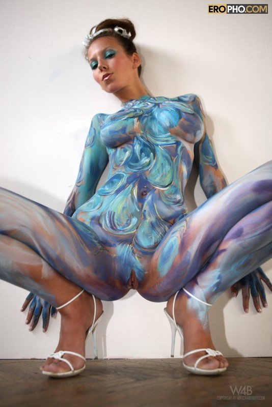 Обнаженная девушка в краске прогибается раком